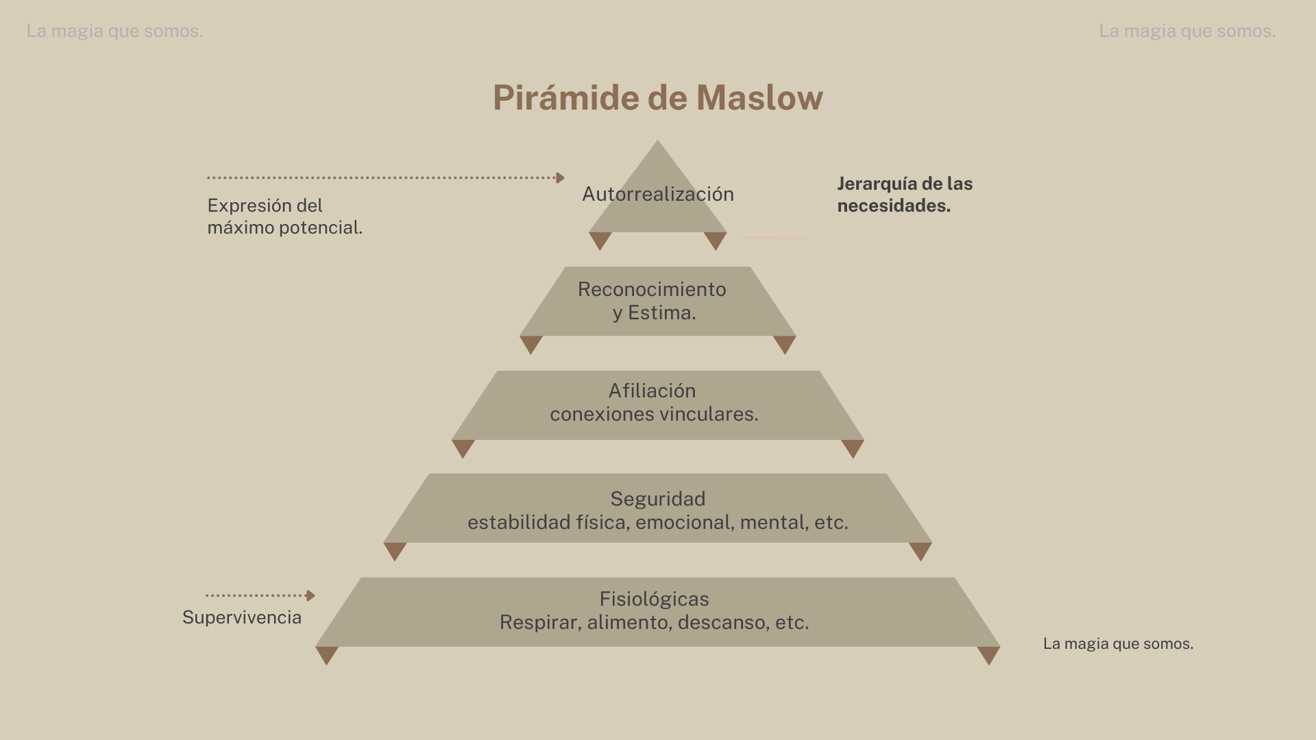 Según Maslow, en su pirámide, organizó jerárquicamente una serie de necesidades que todos buscamos satisfacer: